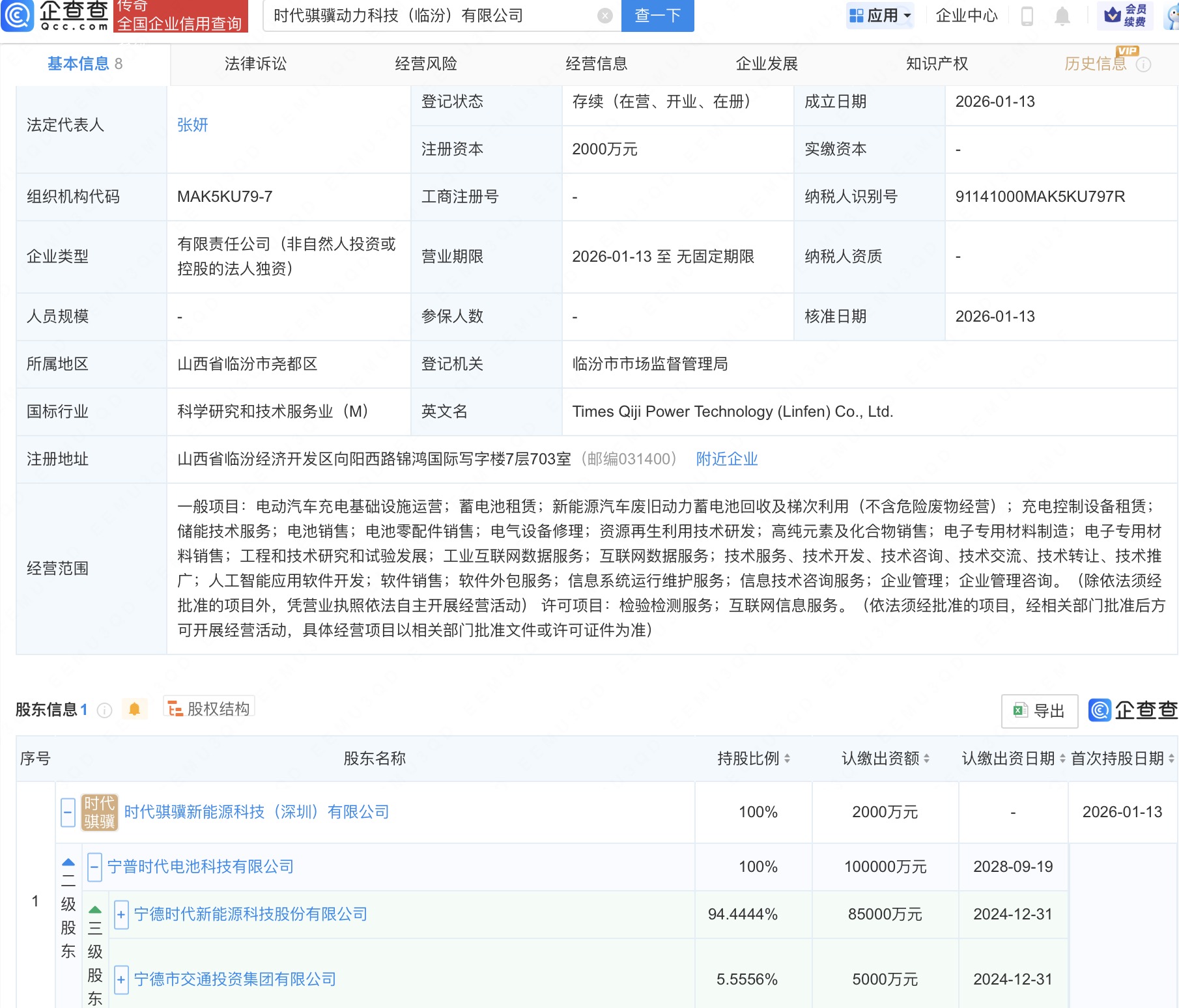 近日,时代骐骥动力科技(临汾)有限公司成立,法定代表人为张妍,注册资本2000万人民币,经营范围含电动汽车充电基础设施运营、蓄电池租赁、新能源汽车废旧动力蓄电池回收及梯次利用、充电控制设备租赁、储能技术服务等。企查查股权穿透显示,该公司由宁德时代(300750)旗下时代骐骥新能源科技(深圳)有限公司全资持股。