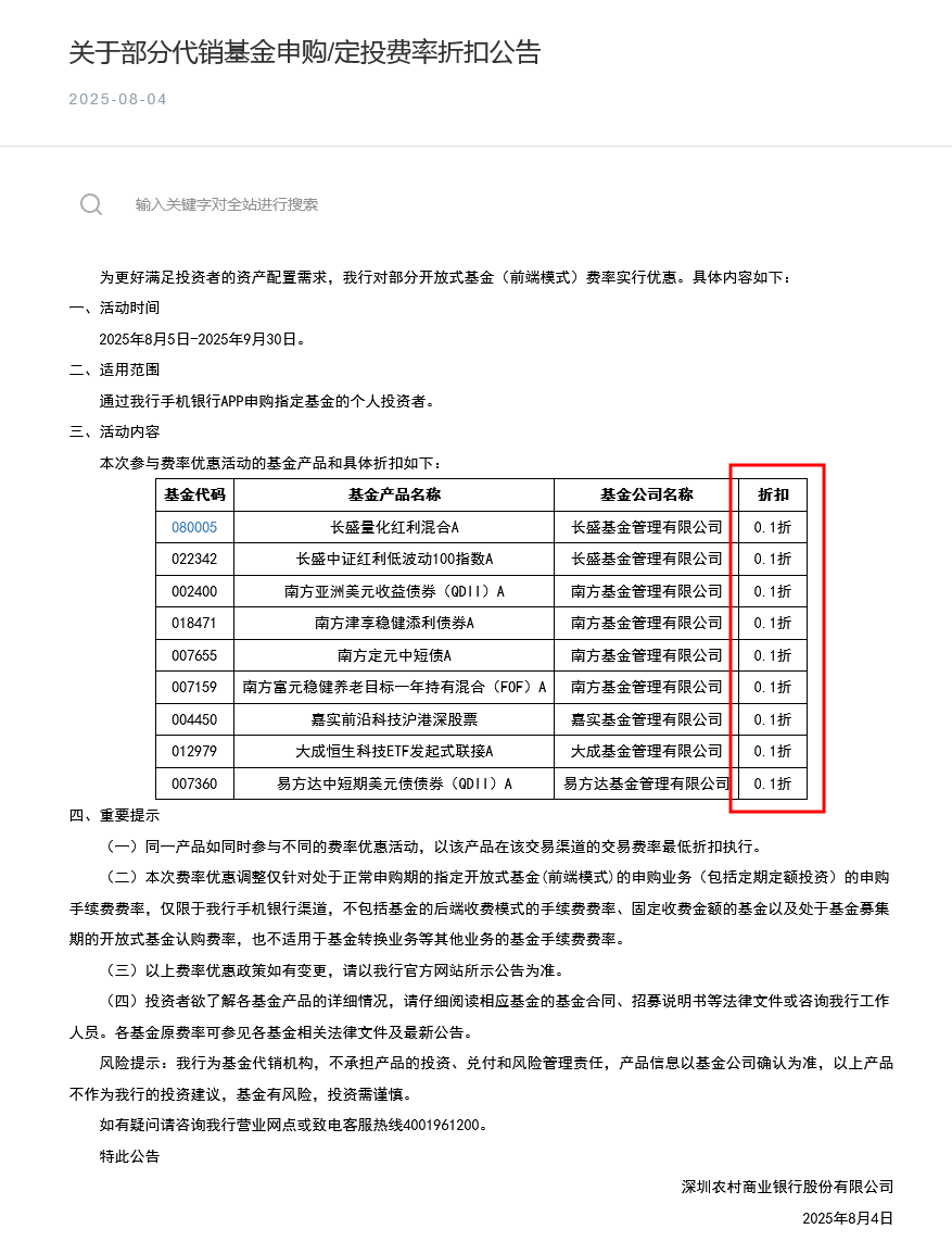 8月4日,深圳农商行发布公告称,自8月5日起,投资者通过该行手机银行APP申购指定的9只开放式基金(前端模式),可享申购手续费0.1折优惠,涵盖定期定额投资业务。该行特别提示,优惠仅适用于正常申购期的指定基金,不包括后端收费、固定金额收费及募集期基金的认购费率。