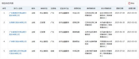 此外,7月4日,同期递交IPO申请的广东顺德农商行已处于“终止(撤回)”状态。与此同时,广州银行和安徽马鞍山农商行此前因主动撤回,处于“终止”状态。